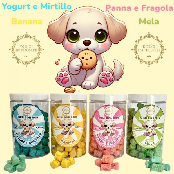 FR:Dolci Impronte | Lot de 3 pièces – Mini Bonbons Arôme Crème & Fraise 170 gLe prix se réfère au lot de trois pièces.Bocal contenant de délicieux petits biscuits colorés en pâte sablée, aromatisés pour rendre la récompense encore plus savoureuse.Aliment complémentaire pour chiens adultes.Caractéristique : biscuit en pâte sablée.Composition : farine...