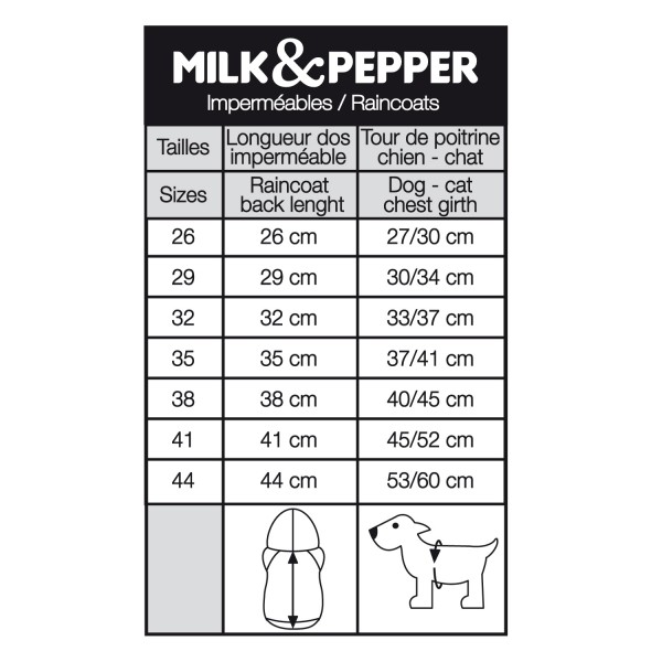 Raincoat with leash opening, hood, and opening adjustment. Sizes from 26 to 44.