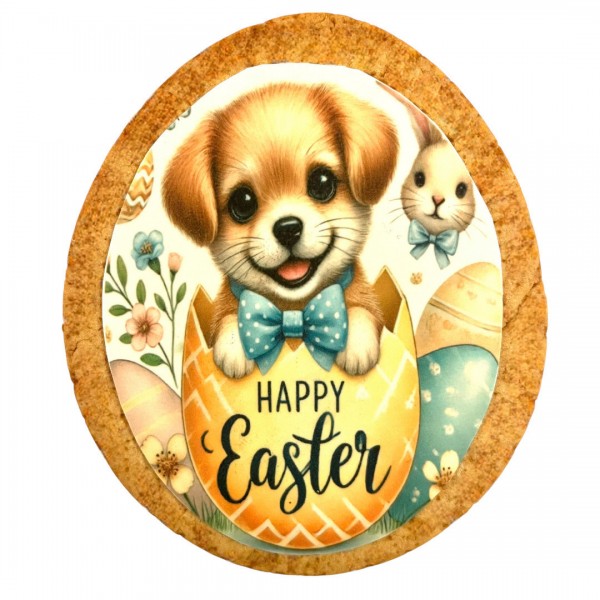 Shortcrust pastry biscuit in the shape of an egg, dimensions 12x9 cm, with "him" printed on an edible wafer. Characteristics: shortcrust pastry biscuit. Composition: flour (soft wheat), fructose, pasteurized eggs, vegetable margarine, honey, starch, sucrose esters, and mono- and diglycerides of fatty acids. Technological additives: preservatives (potassium sorbate 1k202, sorbic acid 1a200, citric acid 1a330), emulsifiers. Organoleptic additives: flavoring, food coloring. Analytical composition: crude protein 8%, crude fiber 1.9%, crude fat 11%, crude ash 0.56%. Net weight: 78g. Complementary feed for adult dogs. Directions for use: serve up to 10% of the total daily ration, the dose is indicative and should be adjusted based on physical activity, age, breed, individual physical condition, and climate conditions. Ensure fresh water is available. Once opened, store the product in a cool, dry place. Produced for Fifty S.r.l., Venice 30124, San Marco 5278, e-mail: info@dolcimpronte.it1 at the IT900011VE facility.