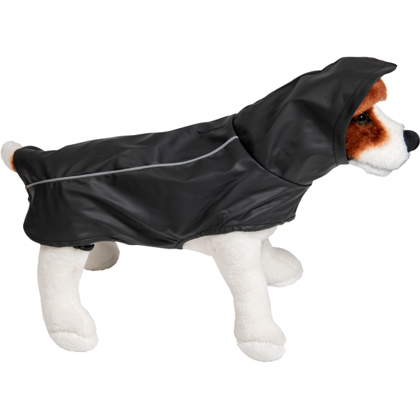Coated raincoat with high collar, reflective elements, leash opening, elastic leg restraints, closure with velcro.