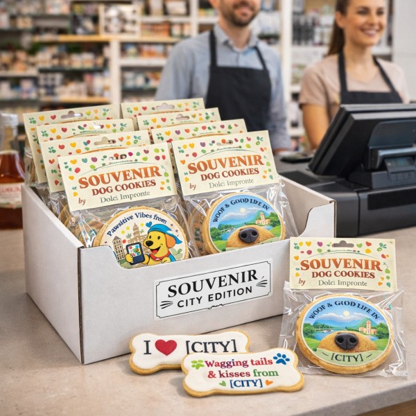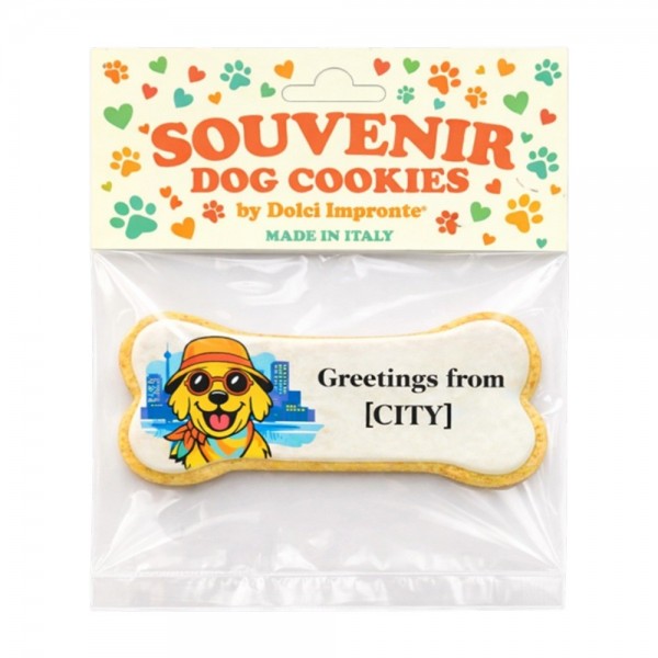 FR Souvenir City Edition by Dolci Impronte WAGGING TAILS FROM [CITY]Un souvenir qui célèbre votre ville avec une illustration dédiée à l’univers pet. Biscuit artisanal en forme d’os, conçu pour les touristes qui voyagent avec leur chien ou souhaitent rapporter chez eux un souvenir original de la destination. Réalisé en Italie et conditionné...