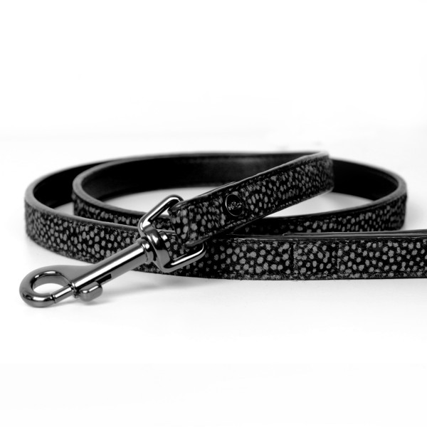 Milk&Pepper - Guinzaglio Quartz Nero lunghezza 120 cm / larghezza 1,5 cm (per collari larghezza 2 cm) lunghezza 100 cm / larghezza 2 cm (per collari larghezza 3 cm) Guinzaglio in similpelle nera Fodera in similpelle nera Bordi con smalto abbinati al guinzaglio Moschettone in colore titanio Rivetti con il logo inciso...