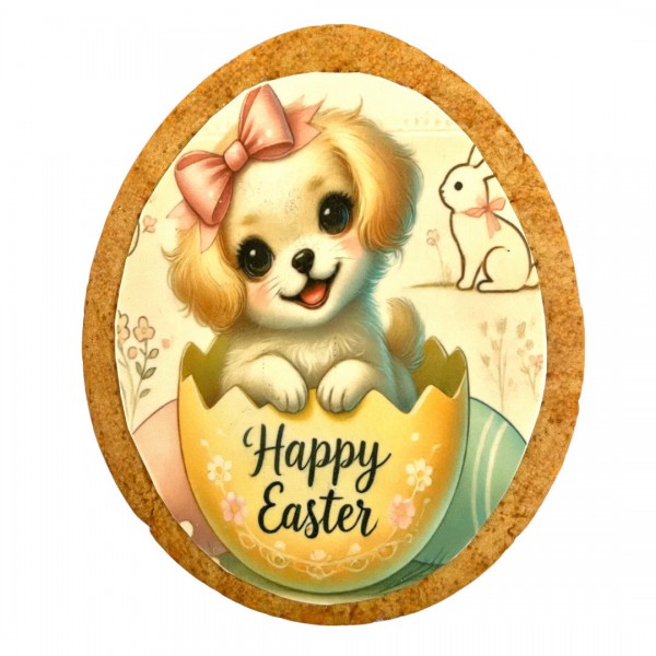 Biscotto in pasta frolla, a forma di uovo, dimensioni 12x9cm, con stampa su cialda alimentare applicata a mano.